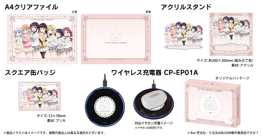 本コラボレーションモデルは作品タイトルを充電ケースに、作品モチーフを左右ハウジングプレートに配置。新規録り下ろし音声ガイダンスは「ココア」「チノ」「リゼ」「千夜」「シャロ」「マヤ」「メグ」の中から1つ選択可能で、お選び頂いた音声ガイダンスを搭載しお届け致します。電源オンやオフ、ペアリング時やタップ音等、それぞれ計11ワードのボイスを楽しめます。イヤホンお届け時期に専用アプリ「ANIMA Studio」にて7キャラクターそれぞれの音声ガイダンスのDL販売を予定しております。TVアニメ 『ご注文はうさぎですか?』ワイヤレスイヤホンご購入者のみDL購入が可能で、初期搭載ボイス(購入モデルのボイス)に加え、DL購入ボイスも楽しめる仕様となっております。パッケージは描き下ろしイラストデザインとなっております。