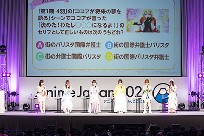 第1問は、第1期第4羽より出題。ココアのセリフ「決めた!わたし●●●●●●●●になるよ!」の空欄に入る正しい言葉を選ぶ問題で、選択肢は「A.街のバリスタ国際弁護士」「B.街の国際弁護士バリスタ」「C.街の弁護士国際バリスタ」「D.街の国際バリスタ弁護士」の4つが提示されました。