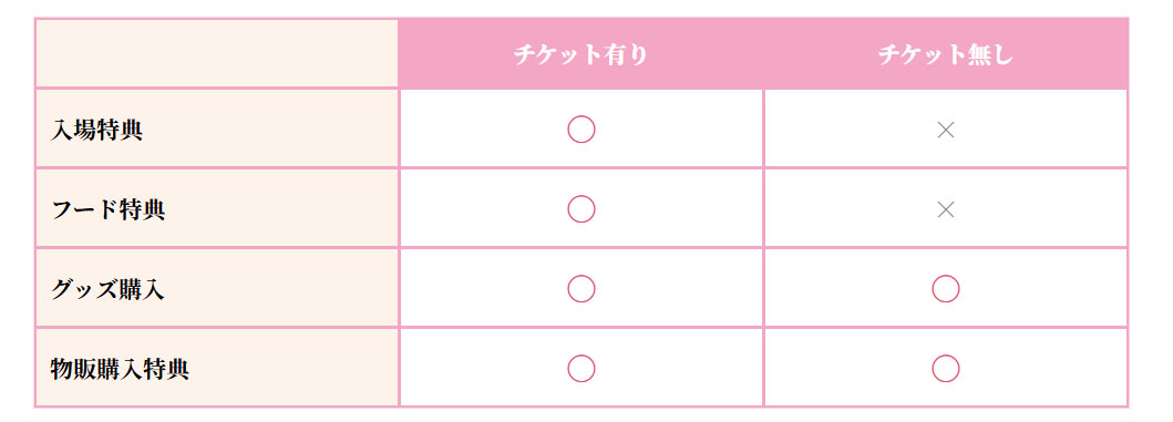 コラボ参加チケットをご購入いただくと、限定の入場特典や、フード特典が入手できます。